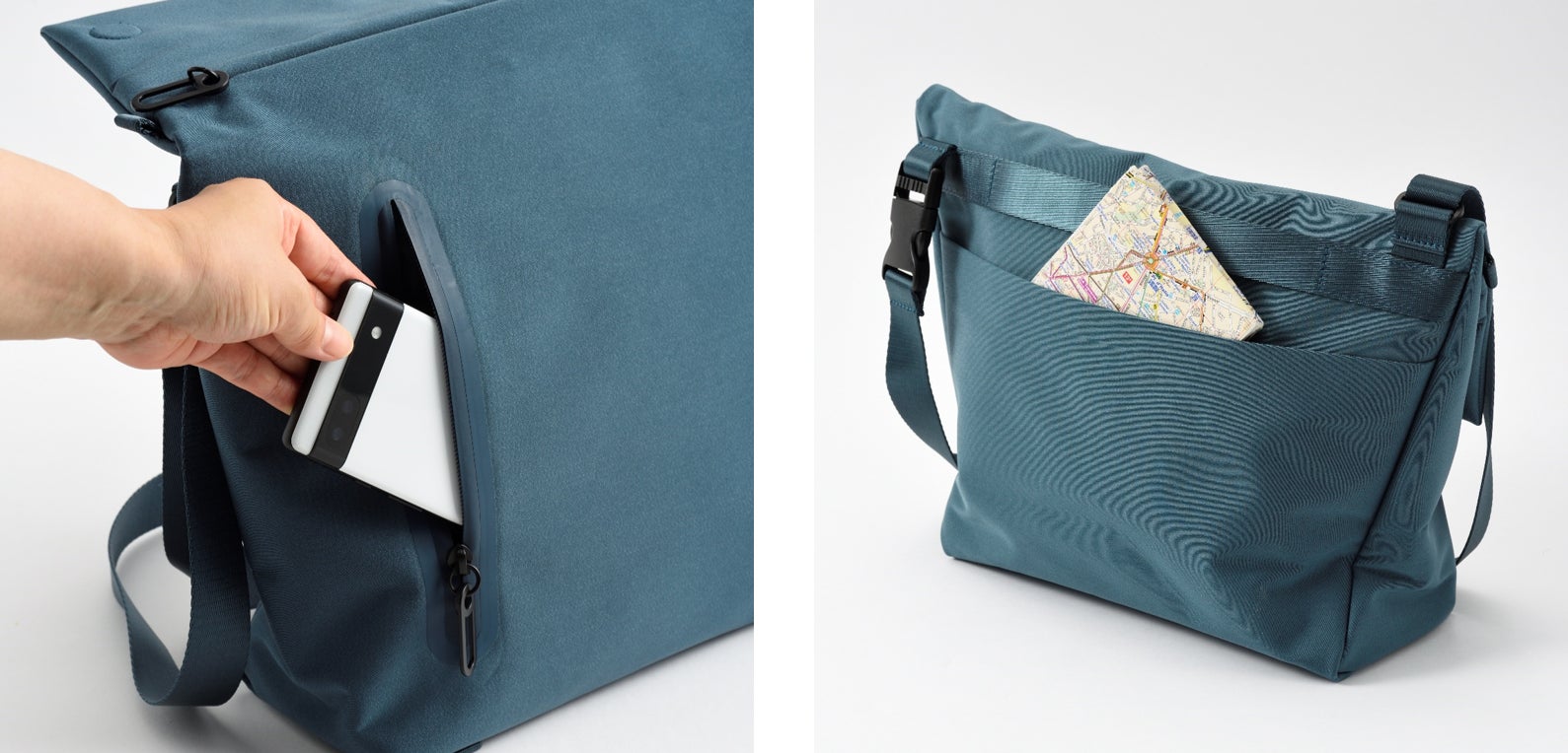 前面にはイヤホンやモバイルバッテリーなど、すぐに取り出したいものの収納に便利なファスナーポケットを装備。メインコンパートメント内にはリップやメモ帳が収納できる小分けポケットを、背面にはパスケースやマップ、ガイドブックなどの収納に便利なオープンポケットを搭載。