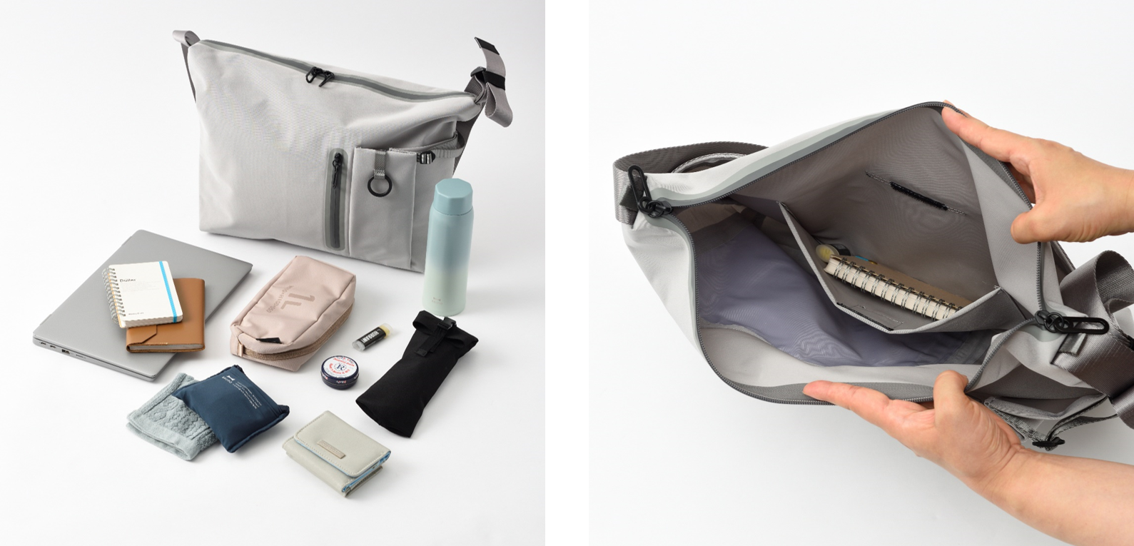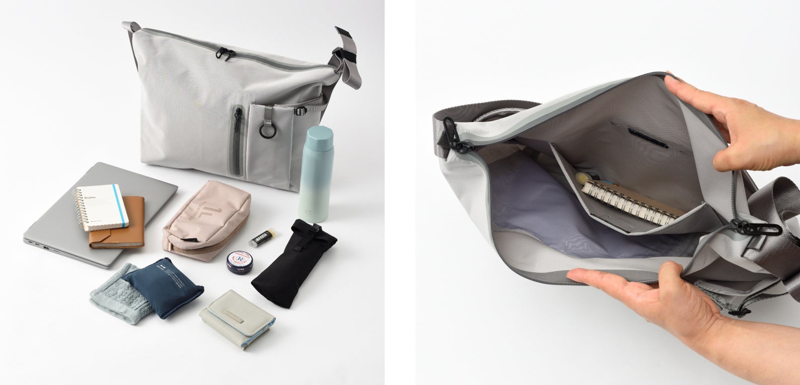 A4書類やPCケースに入れた13インチノートPC、ケース装着したタブレットも収まる大きめサイズを採用。メインコンパートメントには、バッグ内の整理に便利な小分けポケットを設置。