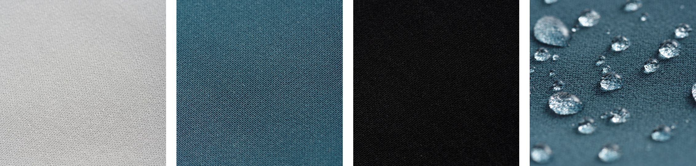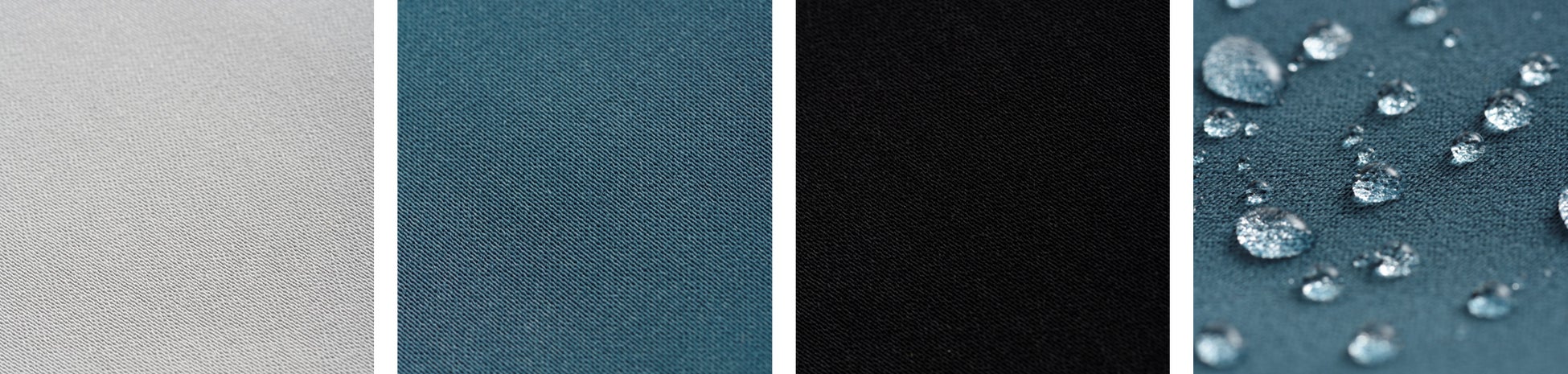 ※左からライトグレー、ブルーグリーン、ブラックの3色展開と撥水のイメージ。