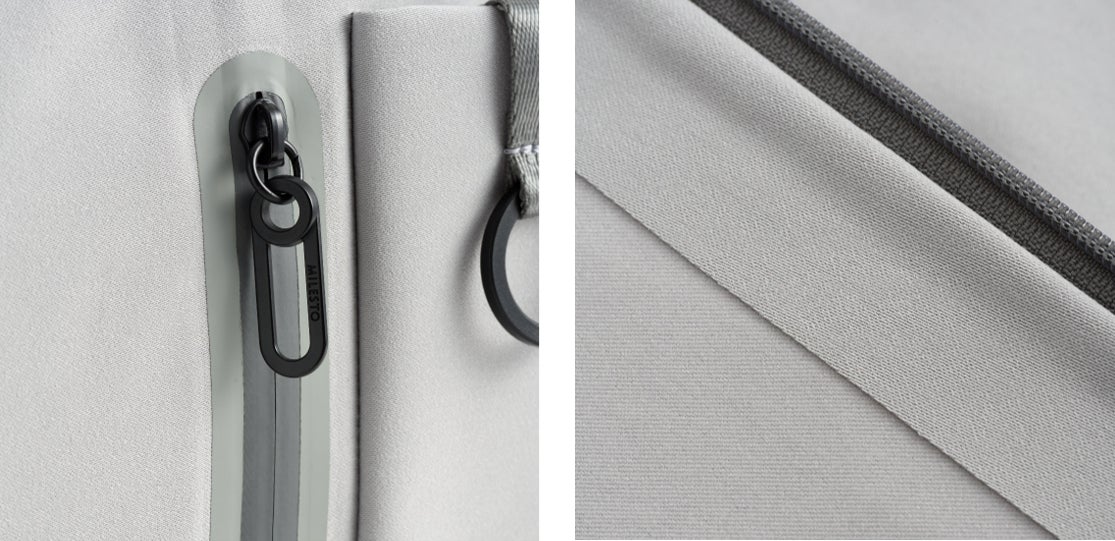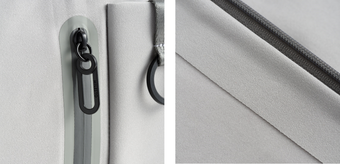 ファスナー部分は無縫製で高周波の圧着を施した止水ファスナーを採用し、縫製部の裏側をシーリング加工することで雨水の侵入を防ぎます。
