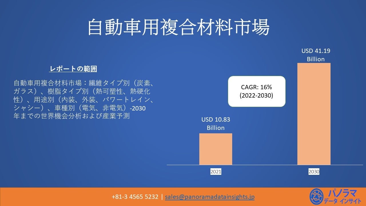 世界の自動車用複合材料市場は、2030年までに411.9億米ドルの価値があると予想されています| (CAGR)年平均成長:16%