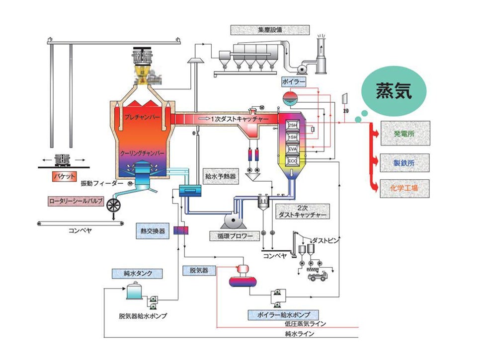 ※ コークス乾式消火設備(CDQは「Coke Dry Quenching」の略)は、コークス炉で乾留された赤熱コークスを、冷却塔内で不活性ガスを用いて冷却するとともに、従来は放散していた赤熱コークスの顕熱をボイラーで蒸気として回収する設備です。コークスを冷却する際のダスト発生の抑制、蒸気による発電を通じたCO2排出の抑制、高炉での使用に適したコークス品質の改善、という3つの効果が期待されるため、近年益々注目されております。