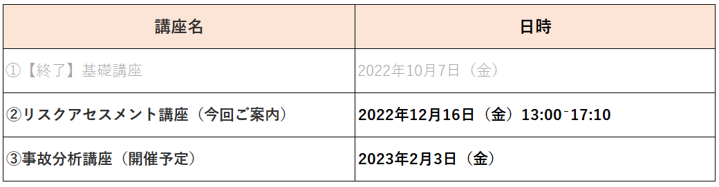 製品安全分野におけるリスクアセスメントの基礎を学べるので、ご関心のある方はぜひお申し込みください。