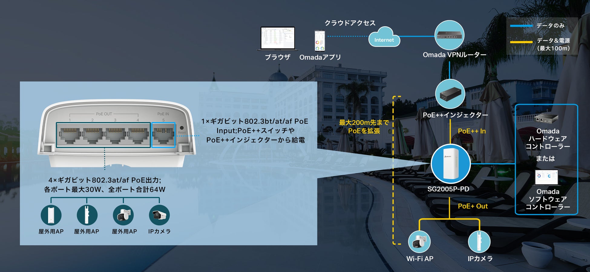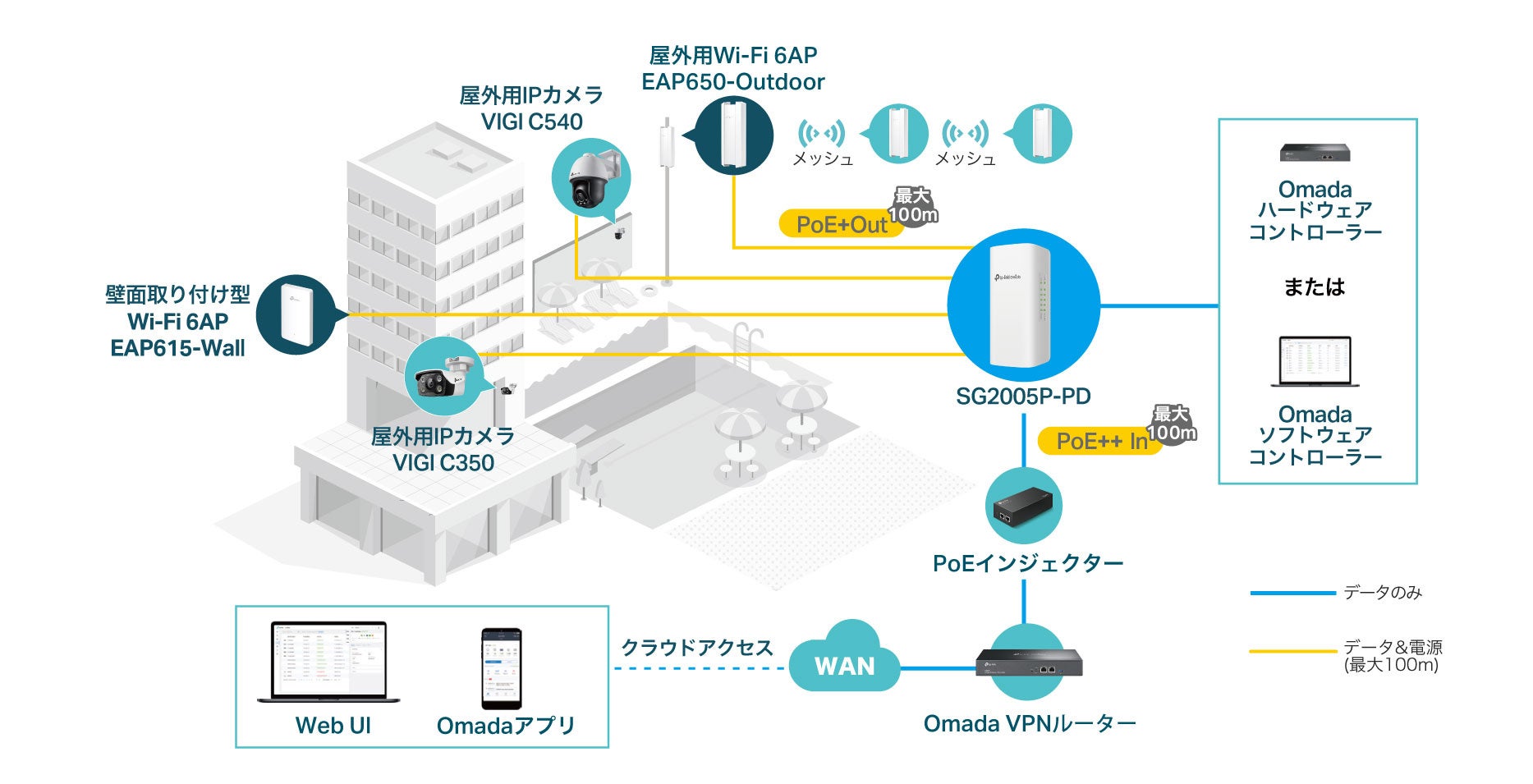 屋外での利用が増加しているセキュリティカメラや無線LAN機器の設置を、Omadaシリーズの最新ラインナップ「SG2005P-PD」が柔軟にサポートします。