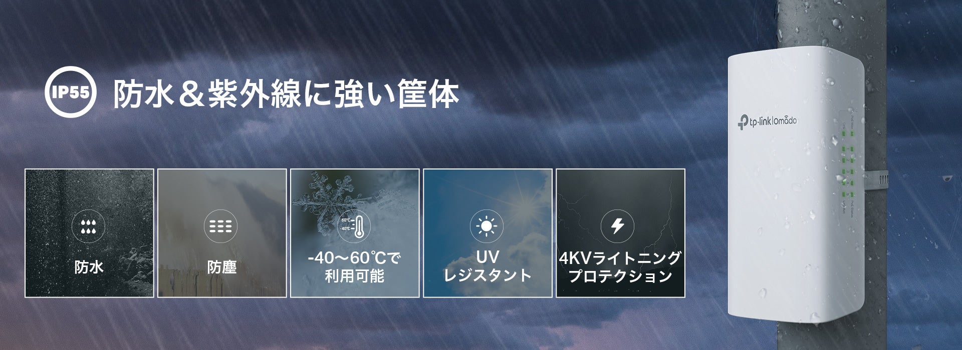 ・屋外対応:IP55の防水防塵性・UV耐性の筐体、-40~60℃の動作温度と4KVの雷保護により、屋外の過酷な条件下でも安定して動作