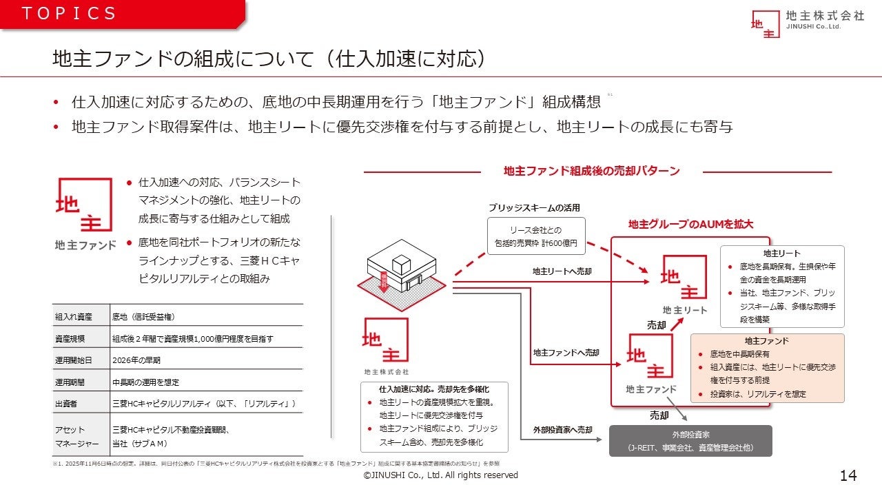 当社は、投資家からの強い需要を獲得し続ける地主リート及び地主リートへの優先交渉権を付与したリース会社とのブリッジスキームに加えて、「地主ファンド」の活用により、バランスシートをマネジメントしながら、更なる仕入の拡大及び持続的な利益成長を目指してまいります。