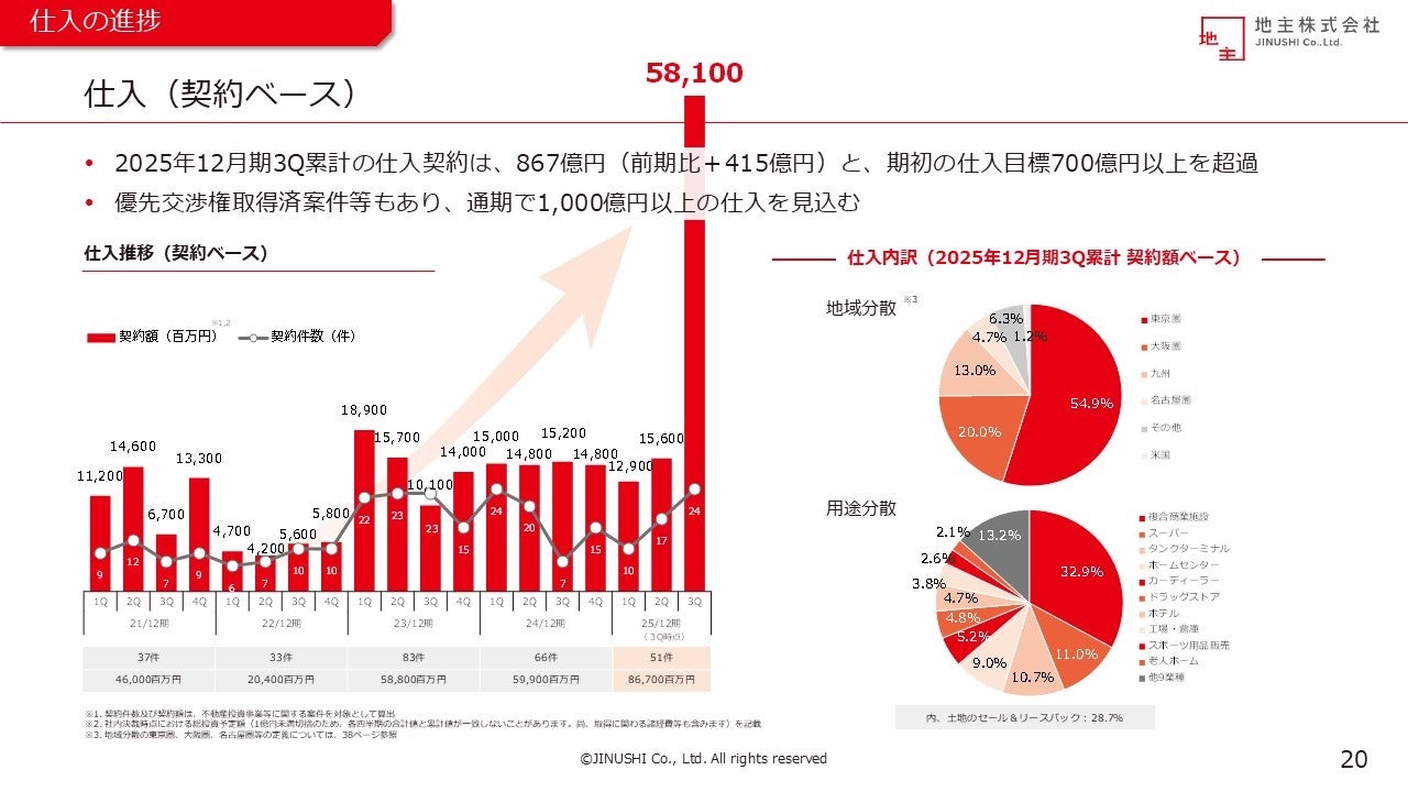 2025年12月期第3四半期累計の仕入(契約ベース)は867億円(前年同期比+415億円)となりました。