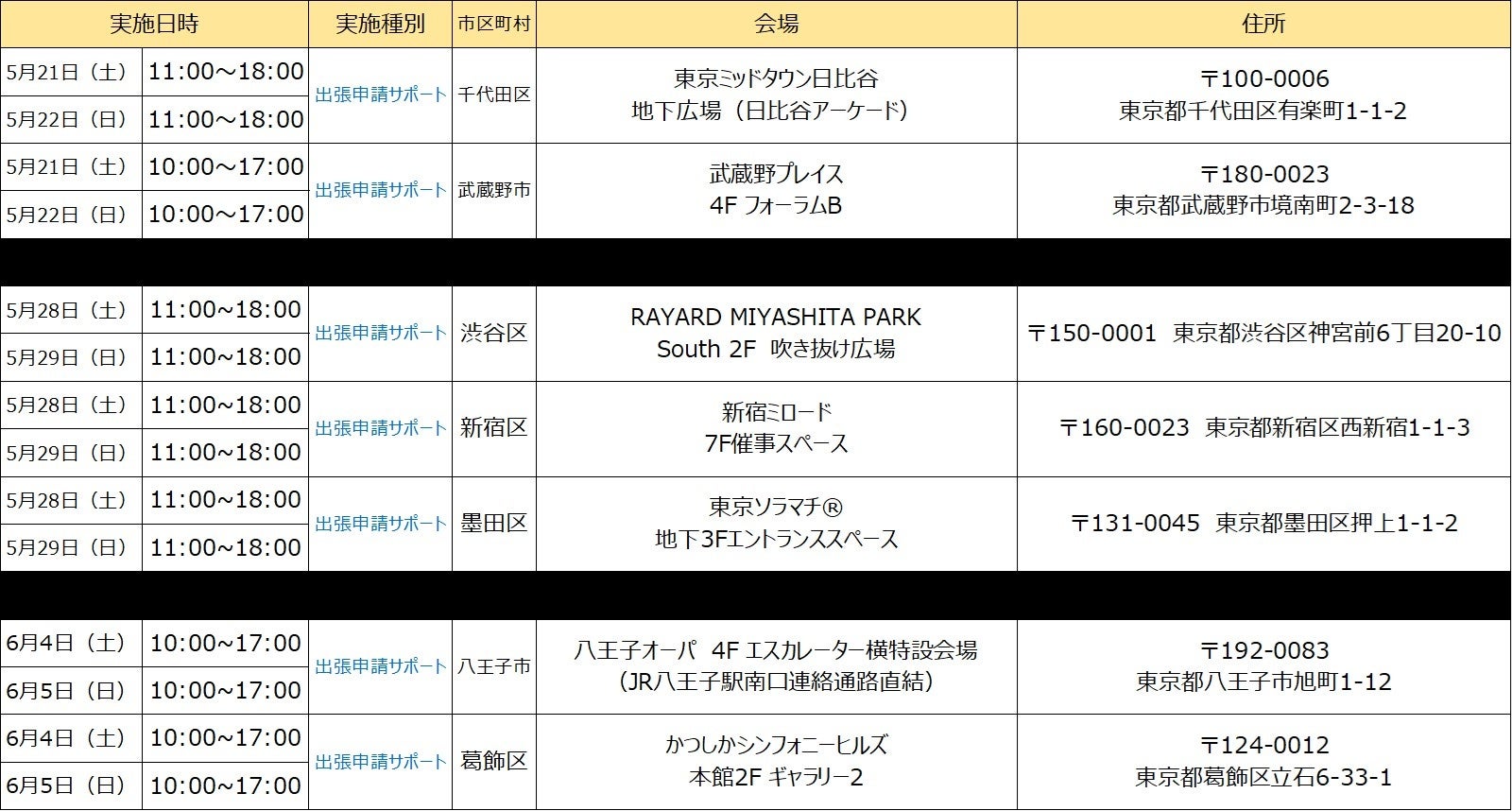 ※開催場所の調整状況や新型コロナウィルスの感染状況等により、「出張申請受付」及び「出張申請サポート」の開催を中止・延期、または実施内容が変更となる可能性がございます。