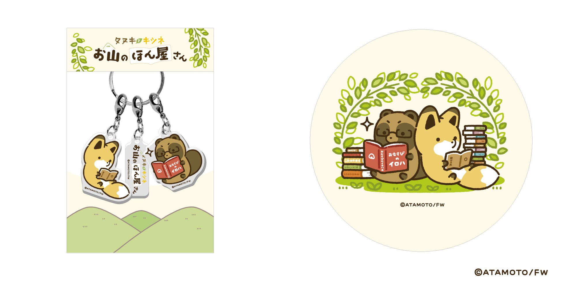 (左) 3連アクリルキーホルダー タヌキとキツネ お山のほん屋さん 990円(税込)