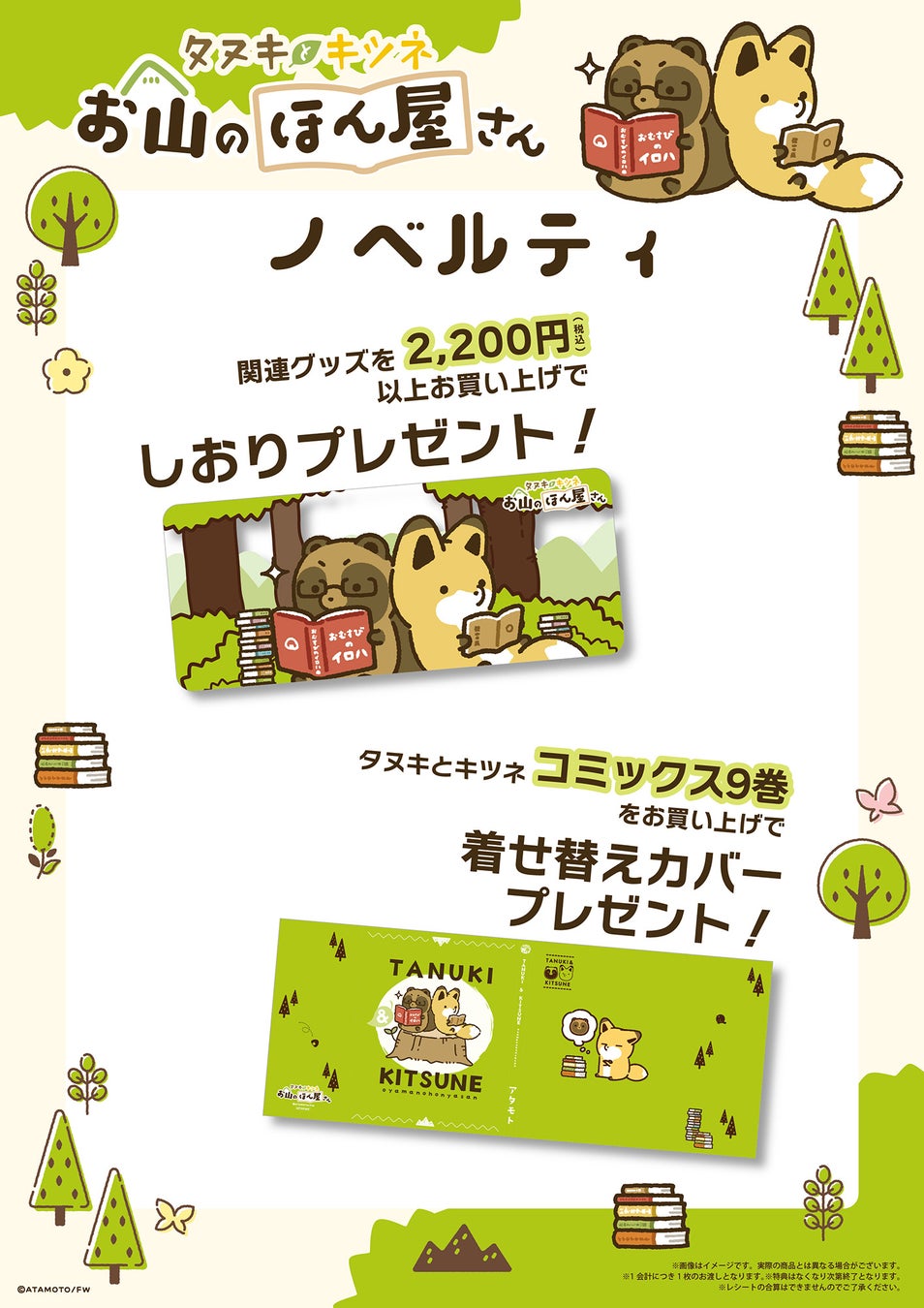 フェア開催店舗では、タヌキツ書店限定グッズを2,200円(税込)以上お買い上げのお客様に、ノベルティとして「しおり」を1枚プレゼントいたします。また書店限定グッズと同時発売の「タヌキとキツネ」コミックス9巻(フロンティアワークス)を1冊お買い上げのお客様に「着せ替えカバー」を1枚プレゼントいたします。