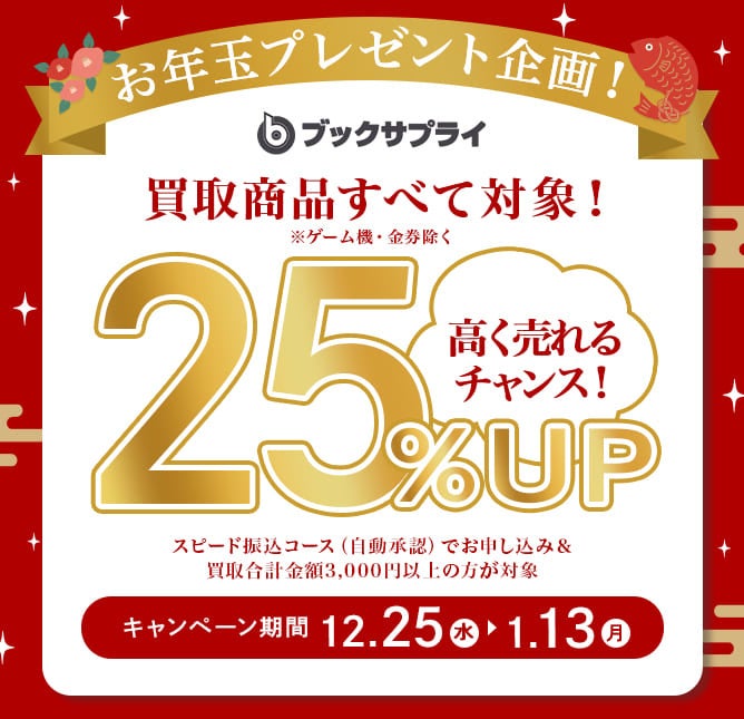 ・キャンペーン条件を満たしていない場合、25%UPの特典は適用されません。 ・他のキャンペーンとの併用はできません。 ・同一商品の複数買取は古物営業法に基づき不可となります。 |