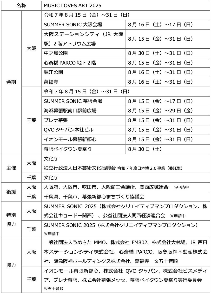 日本の文化芸術のグローバル展開に向けて、国際的に影響力・訴求力のあるグローバル拠点を形成し、新たな文化を創造するためアプローチとして、文化庁がアートと音楽の異分野融合による取り組みを推進するなか、世界に展開できる作品をアーティストとともに創作し、日本を文化芸術のグローバル発信拠点へと成長させるプロジェクト「MUSIC LOVES ART 2025」を、8月15日(金)から31日(日)の17日間にわたり開催します。本プロジェクトは、多様な産業領域と協業し、日本の文化芸術資産であるアートと音楽の融合を図り、日本を舞台に展開する芸術コンテンツとして発信するとともに、世界各国から訪れる人々との交流を通じて、未来を創造することを目指しています。