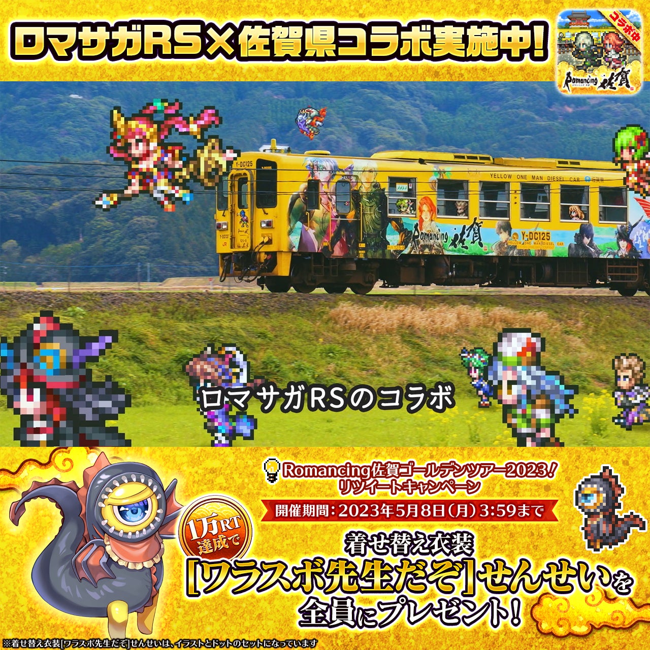 佐賀県×「サガ」シリーズのコラボレーションプロジェクト「ロマンシング佐賀」のゲーム内コラボイベントを記念して、TVCM『ロマ佐賀ゴールデンツアー篇』を、2023年5月1日(月)、5月2日(火)に放映いたします。本CMは、『ロマンシング佐賀2022』で実際に佐賀県を走っている、ラッピング列車「ロマ佐賀列車」を中心に、佐賀県の実際のロケーションと、これまでにゲーム内で登場したすべての佐賀県コラボスタイル全36体が登場! 新スタイルと共に、コラボレーションを盛り上げる内容となっております。
