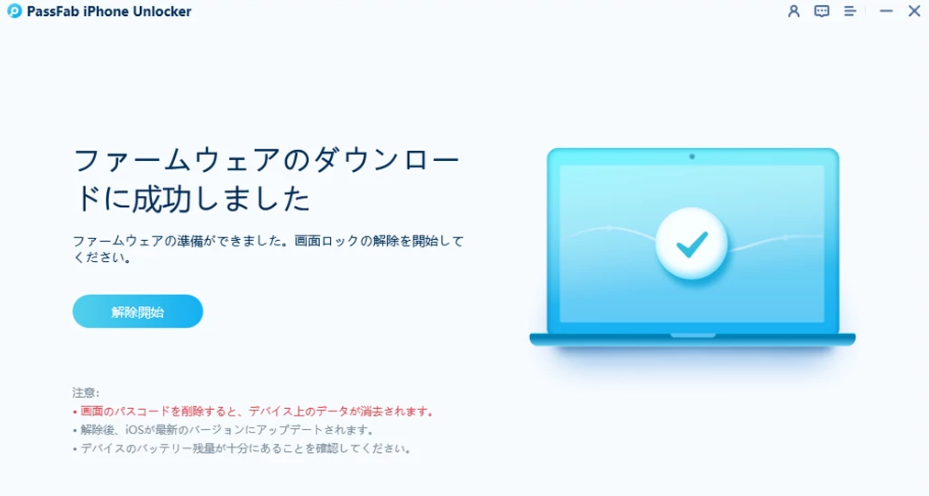Step3:ダウンロードが完了すると以下の画面のように「解除開始」の項目が表示されます。ここからいよいよiPhoneのパスコードを解除します。「解除開始」をクリックし進めましょう。解除作業中、iPhoneはロゴのマークが表示されている状態になります。