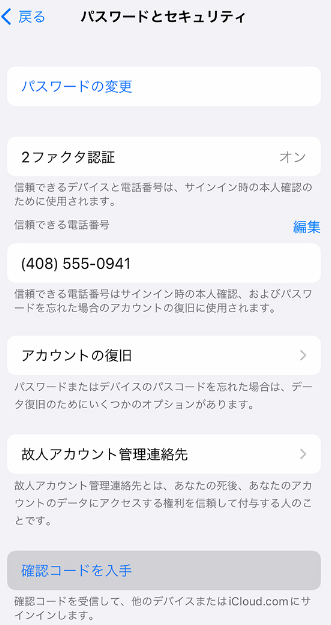 Step2:「パスワードとセキュリティ」から「確認コードを入手」を選択