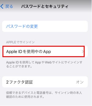 また、iPhoneでは「設定」からユーザー名とアイコンの表示個所へ進み、「Apple IDを使用中のApp」を開くと、現在この設定がされているアプリケーション等を確認できます。