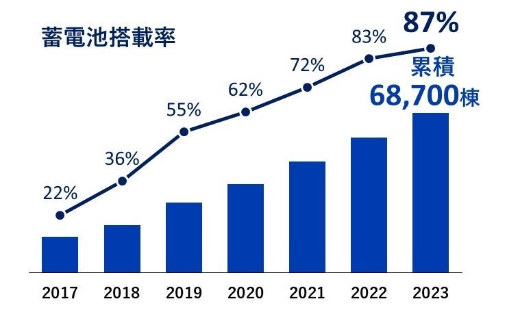 このように、多雪エリアを含めたより多くのお客様に「できるだけ電気を買わない、地球環境に優しい暮らし」を普及する取り組みが功を奏し、2023年度の新築戸建住宅での蓄電池採用率は87%(※6)を突破、累計で6.8万棟(※3)に達しました。また、PV搭載住宅は、累計で24.6万棟(※13)に達しました。