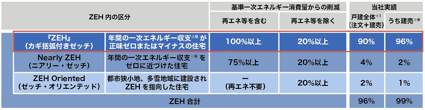 ※1 ZEH比率、『ZEH』比率は、ZEHビルダーの報告方法(注文住宅と建売住宅、それぞれの『ZEH』、Nearly ZEH、ZEH Orientedにおける計算結果の小数点以下を切り上げたうえで合計した計算方法)に基づいて集計した実績です。ZEHには『ZEH』のほか、Nearly ZEH、ZEH Orientedを含みます。
