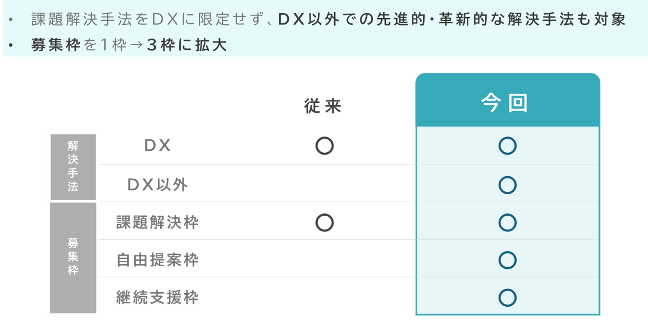 今年度は、デジタルに限らず、先進的・革新的な取組みを幅広く募り、5月13日から第一弾(自由提案枠)の応募受付を開始します。
