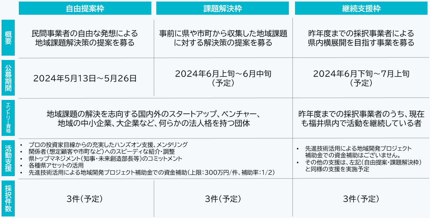 募集枠の概要については、表のとおりです。詳細や最新の情報につきましては、Webサイト(https://co-fukui.jp/)をご確認ください。なお、課題解決枠、継続支援枠の詳細については、順次公開いたします。
