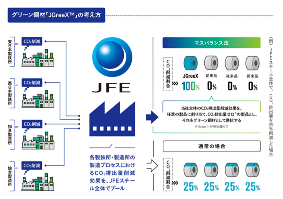 JFEスチールのCO2排出削減技術により創出した削減量を、「マスバランス方式(※2)」を適用して任意の鋼材に割り当てることで、鉄鋼製造プロセスにおけるCO2排出量を大幅に削減した鉄鋼製品です。
