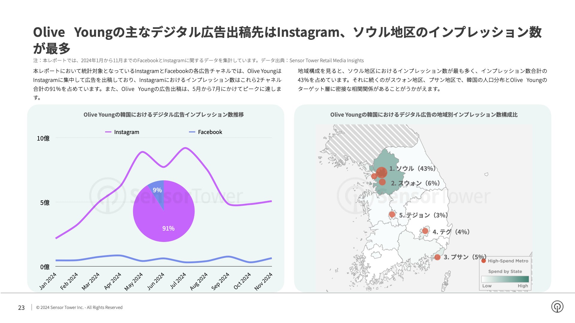 InstagramおよびFacebookの各広告チャネルのうち、Olive YoungはInstagramに集中して広告を出稿しており、そのInstagramにおけるインプレッション数は、これら2チャネル合計の91%を占めています。また、Olive Youngの広告出稿は、5月から7月にかけてピークに達します。地域構成を見ると、ソウル地区におけるインプレッション数が最も多く、インプレッション数全国合計の43%を占めています。
