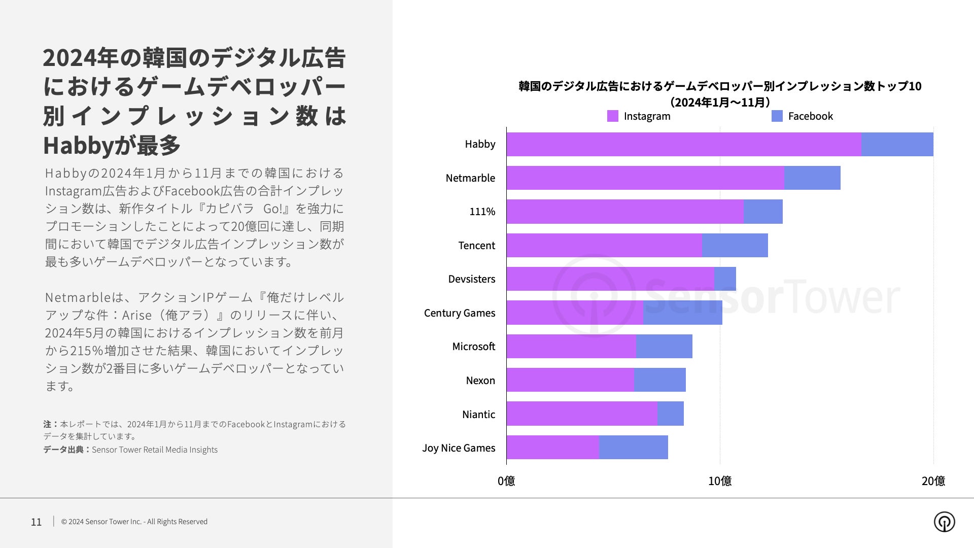 Habbyの2024年1月から11月までの韓国におけるInstagram広告およびFacebook広告の合計インプレッション数は、新作タイトル『カピバラ Go!』を強力にプロモーションしたことによって20億回に達し、同期間において韓国でデジタル広告インプレッション数が最も多いゲームデベロッパーとなっています。