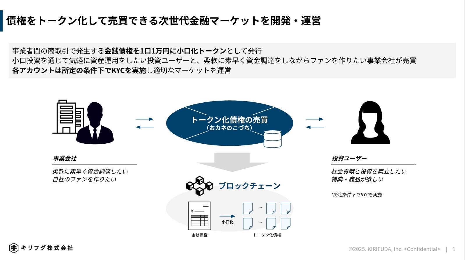 自社運営の「おカネのこづち」で培った金銭債権トークン化技術を核に、DeFi基盤を新規構築。将来的には多様な金融商品・債権のトークン化にも展開