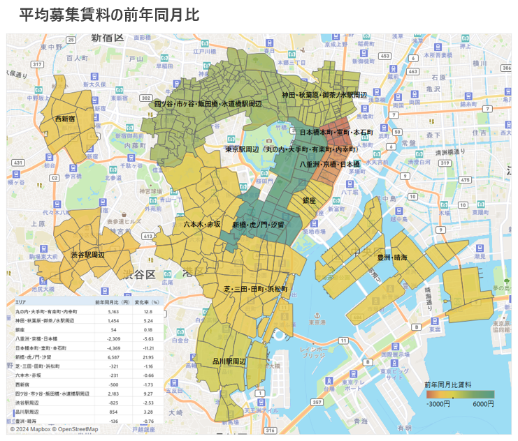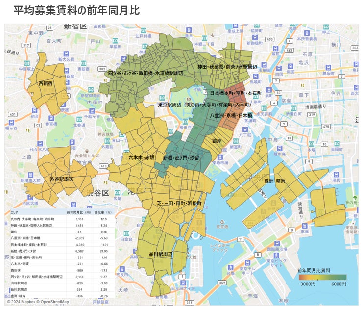 平均募集賃料は7エリアにおいて下落しており、最も下落した「日本橋本町・室町・本石町」では、前年同月比で-4,369円/坪となった。前年同月比で最も平均募集賃料が上昇したエリアは「新橋・虎ノ門・汐留」であり、+6,587円/坪と大幅に上昇した。当該エリアは、2023年の新規供給が多かったことから、募集賃料が高い物件が市場に出たことで、空室率と平均募集賃料が共に上昇したと推察される。「大手町・丸の内・有楽町」、「銀座」、「四ツ谷・市ヶ谷・飯田橋・水道橋駅周辺」では、空室率、平均募集賃料共に回復しており、マーケットが比較的堅調であることが窺える。