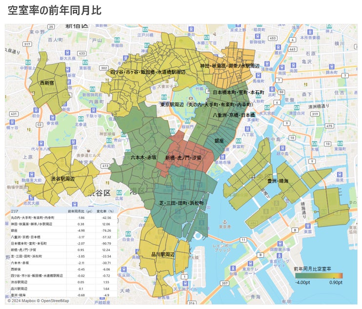 主要13サブマーケットエリアの空室率について、前年同月比を見ると9エリアにおいて回復している。最も回復したエリアは「銀座」であり、前年同月比で-4.98pt。最も上昇したエリアは「新橋・虎ノ門・汐留」であり、前年同月比で+0.95ptとなった。