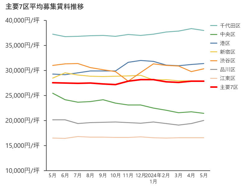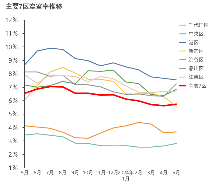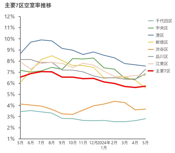 【2024年5月末時点の主要7区空室率・平均募集賃料の動向】