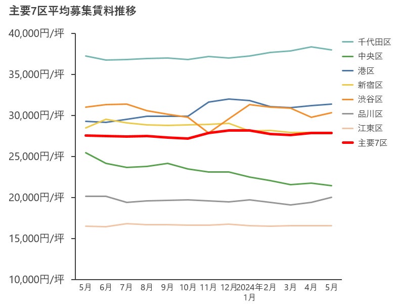 主要7区の空室率について、新宿区で回復、中央区・品川区で上昇、千代田区・港区・渋谷区・江東区で横這いとなった。主要7区の空室率は、回復傾向となっているが、直近では僅かに上昇した。新宿区では、主に西新宿エリアにて空室が消化されたことで空室率が回復した。また、品川区では、前月比で+0.91pt上昇しているが、天王洲・品川シーサイドエリアにおいて、5,000坪弱の空室が出ており、その影響が大きい。平均募集賃料は、渋谷区・品川区で回復、千代田区・中央区で下落、港区・新宿区・江東区は横這いとなった。主要7区の平均募集賃料は、大幅な回復は見られないものの、前月に引き続き回復した。品川区の平均募集賃料は、2023年6月ぶりに20,000円/坪台となった。