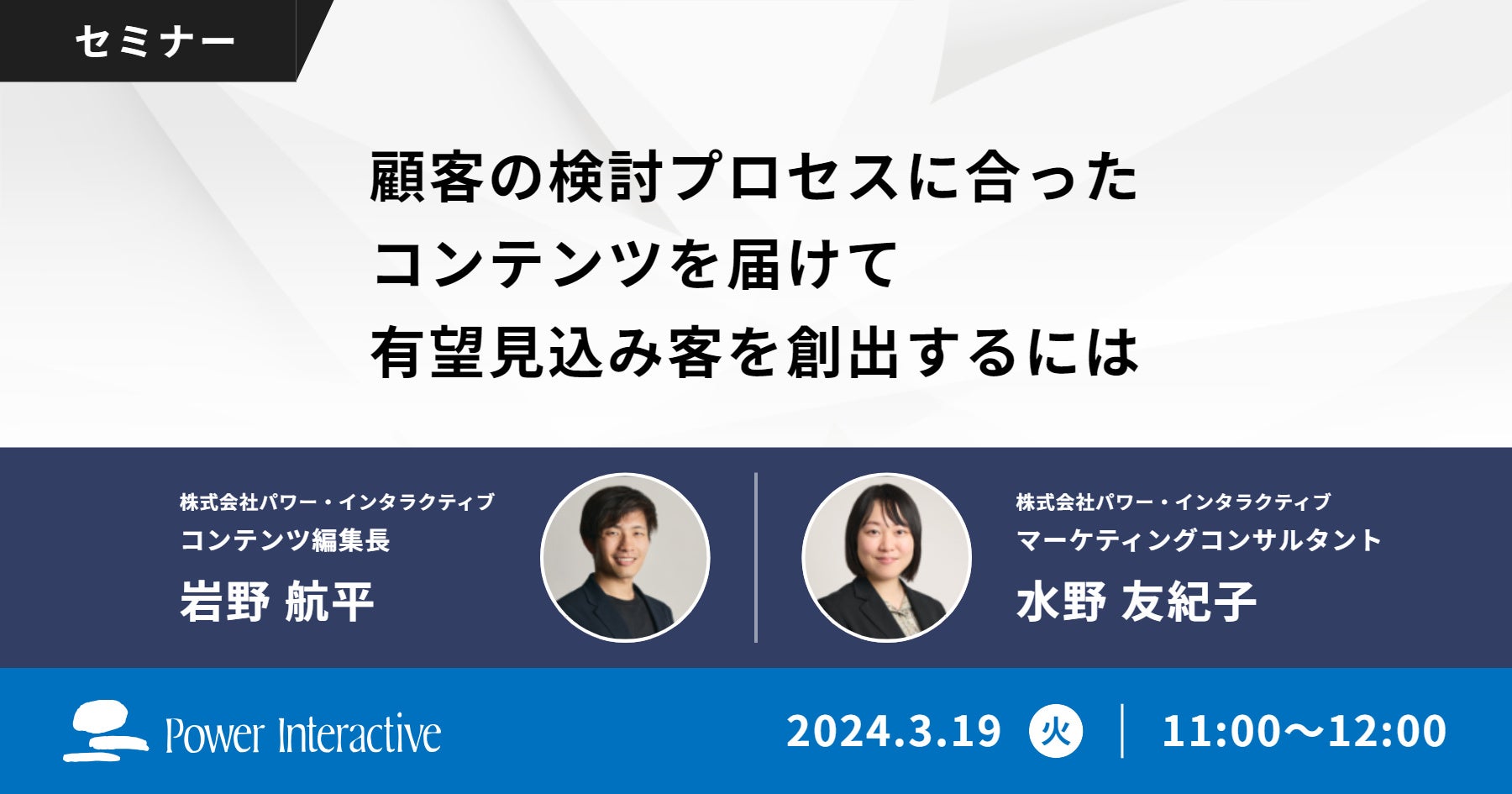 株式会社パワー・インタラクティブは、無料ウェビナー『顧客の検討プロセスに合ったコンテンツを届けて有望見込み客を創出するには』を、3月19日に録画再放送します。