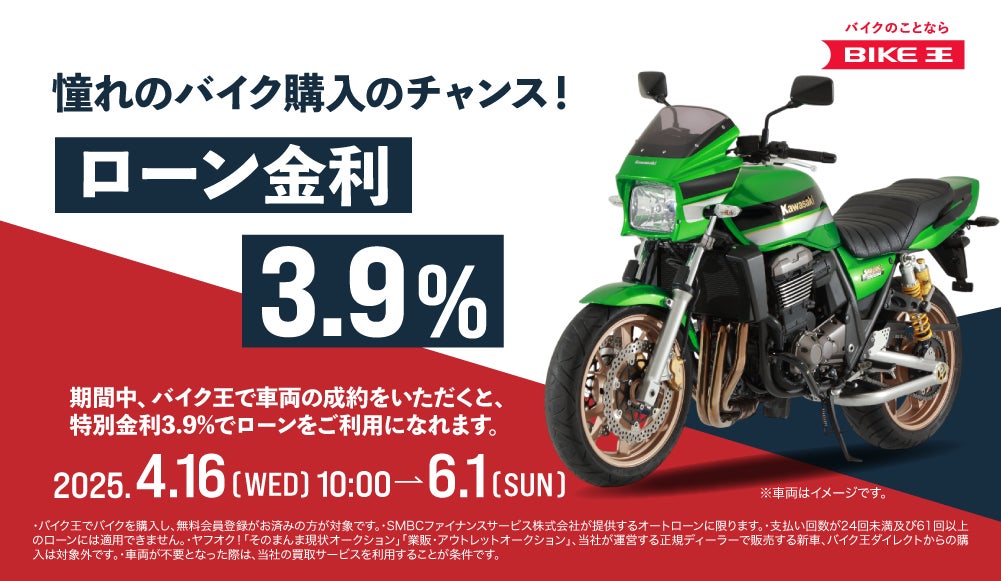 「まだ世界にない、感動をつくる。」をコーポレートミッションに掲げ、ビジョンである「バイクライフの生涯パートナー」の実現に向けて、事業を展開する株式会社バイク王&カンパニー(代表取締役CEO:澤篤史、本社:東京都世田谷区、証券コード:3377、以下「当社」)は、ローン金利3.9%でバイクを購入いただける、「ローン低金利3.9%キャンペーン」を4月16日(水)より開始いたします。