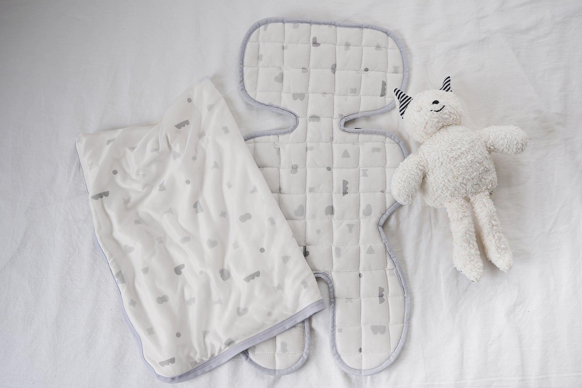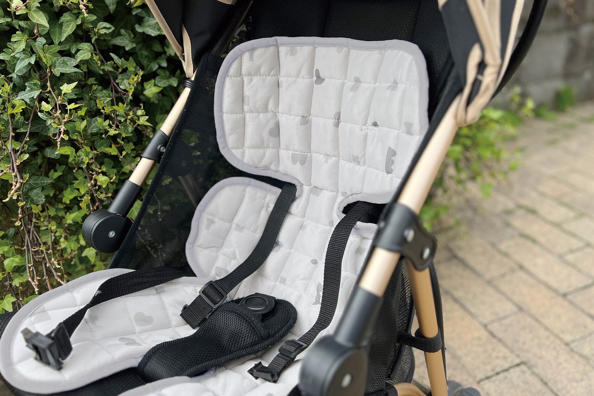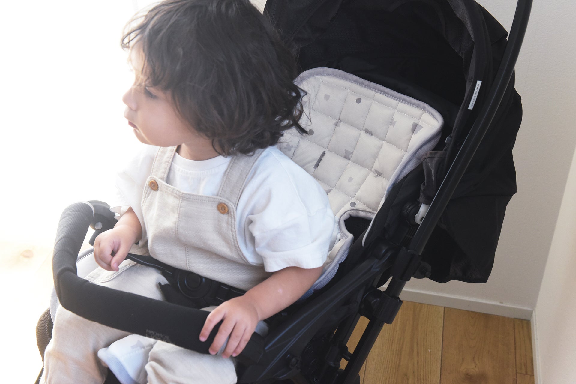 裏面には通気性に優れたメッシュ生地を採用。ベビーカーとのシートの間にすき間を作り、こもりがちな熱を逃がし、ムレを防いでくれます。また、3層構造の間の中綿が、ふわっと心地よいクッションに。涼しいだけでなく、快適な乗り心地を実現します。