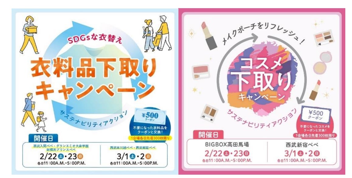 株式会社西武リアルティソリューションズ(本社:東京都豊島区、代表取締役社長:齊藤 朝秀)では、西武鉄道沿線を中心に運営する商業施設において、ご家庭で不要になった「衣料品」や「コスメ」をお持込みいただくとお得なクーポンを進呈する「下取りキャンペーン」を 7 施設合同で開催いたします。これまでも施設ごとに同様の企画を実施していましたが、7 施設合同で行うのは今回が初めてです。