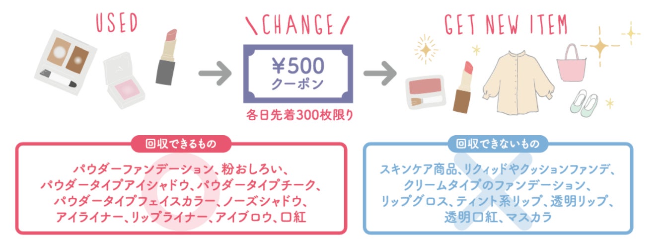 ご家庭で不要になったコスメを回収いたします。お持込みいただいたお客さまへ、館内の対象店舗でのお会計 2,000 円 (税込)以上でご利用いただける 500 円クーポンを進呈いたします。