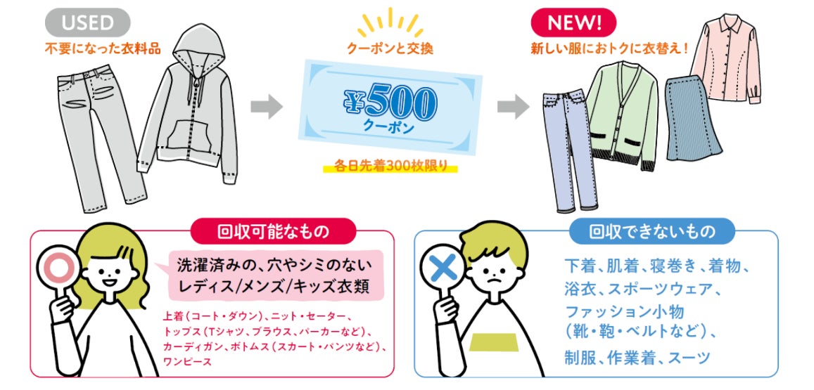 ご家庭で不要になった衣料品を回収いたします。お持込みいただいたお客さまには、館内の対象店舗でのお会計 2,000 円(税込)以上でご利用いただける 500 円クーポンを進呈いたします。