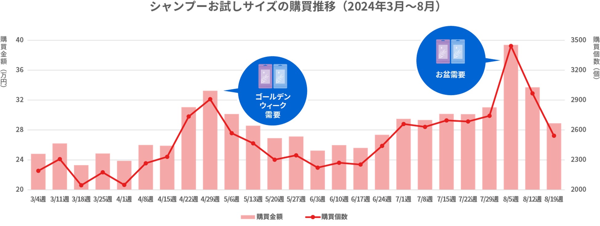 なお、期間内に購入されたお試しサイズの購買推移を見てみると、ゴールデンウィーク前とゴールデンウィーク期間およびお盆前とお盆期間に増加していることが分かります。お試しサイズの需要は、大型連休のシーズンに高まると考えられます。