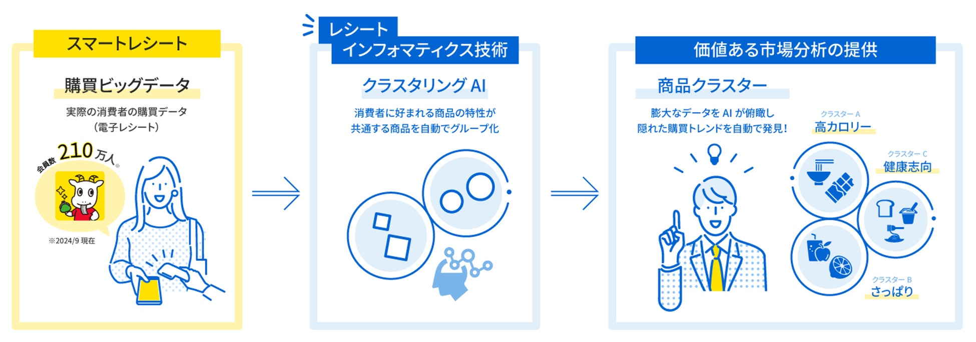 東芝データ株式会社では、実際の購買ビッグデータに基づく価値ある市場分析を提供するために、クラスタリングや自然言語処理など最新のAI技術を活用する「レシート・インフォマティクス技術」の研究開発を推進しています。