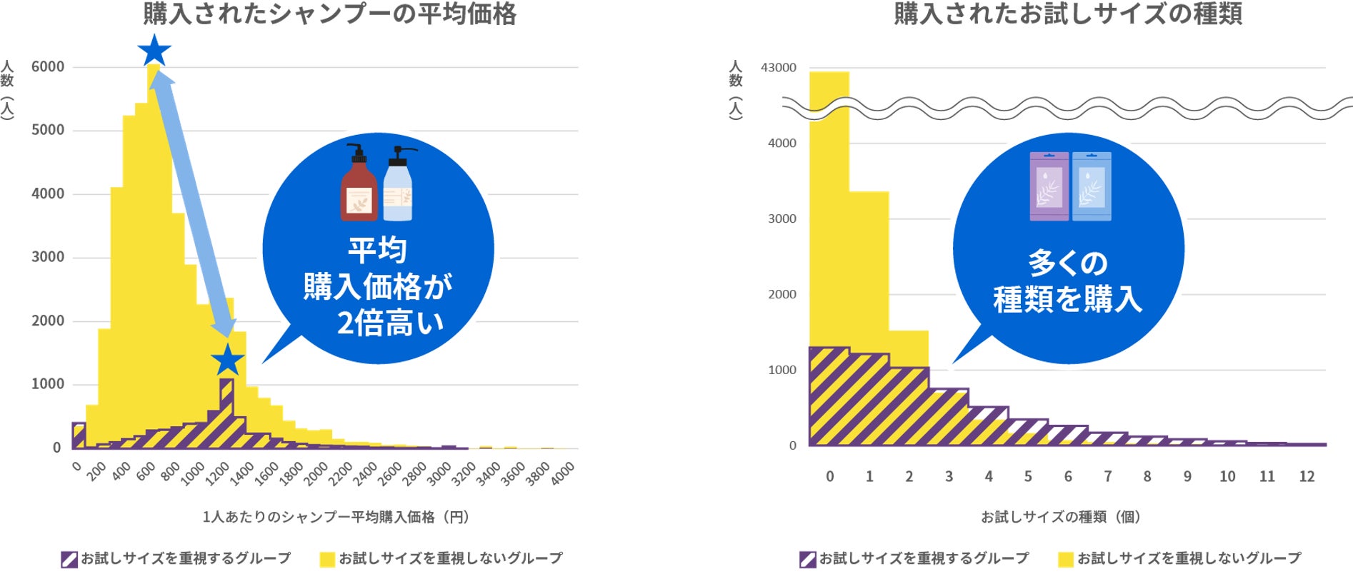 「お試しサイズを重視するグループ」に注目すると、期間内における1人あたりのシャンプー平均購入価格は1,200円台の人が最も多く、重視しないグループ(600円台)に比べ、2倍高いことが明らかとなりました。