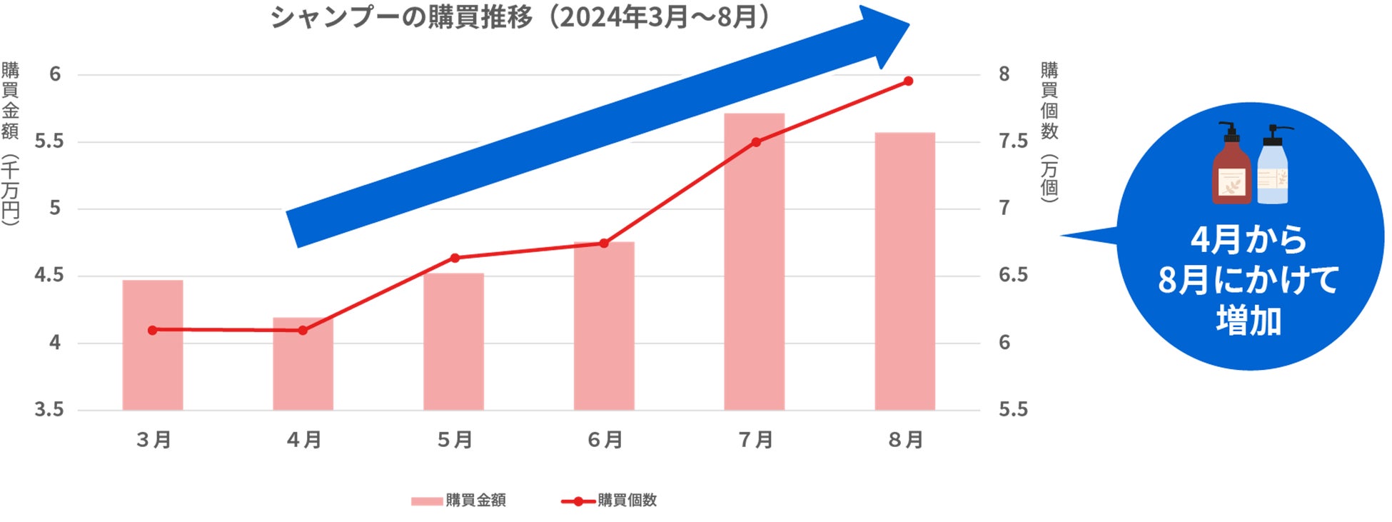 まず、期間内に購入されたシャンプーの購買推移を見てみると、4月から8月にかけて購買個数が増加していることが分かりました。夏はシャンプーの需要が高まる季節と言えます。