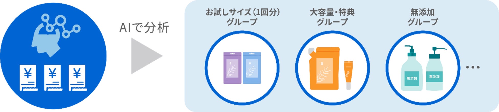 今回、シャンプーの購買傾向分析には、株式会社東芝 研究開発センターが製造やデータ分析の分野で培ってきた独自のクラスタリング技術を、「スマートレシート®」で得られる購買ビッグデータ向けにアレンジし、クラスタリングAIとして適用しました。クラスタリングAIは、実際の購買ビッグデータから、消費者の購買パターン(購買特性)が共通する商品を同じ商品グループ(クラスター)に自動で分類する技術です。クラスタリングAIを活用することで、隠れた購買トレンドの発見や気付きを得ることが可能となります。