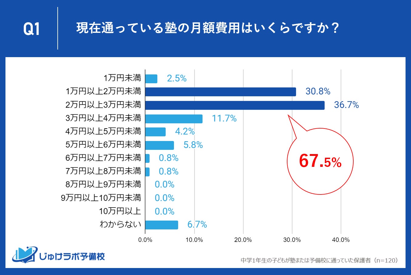 中学1年生の家庭が塾にかける費用は月額「2万円以上3万円未満」が約4割で最多
