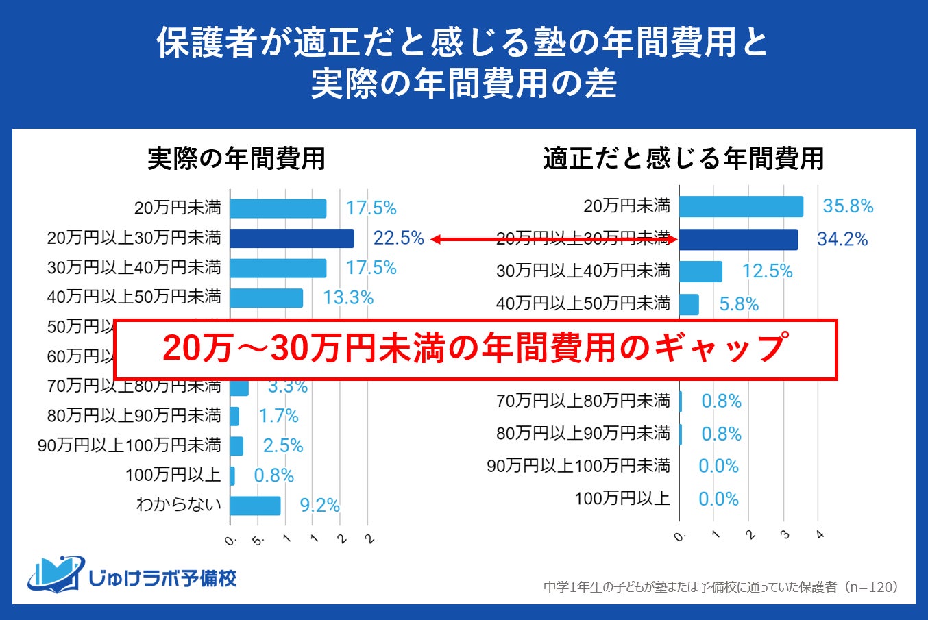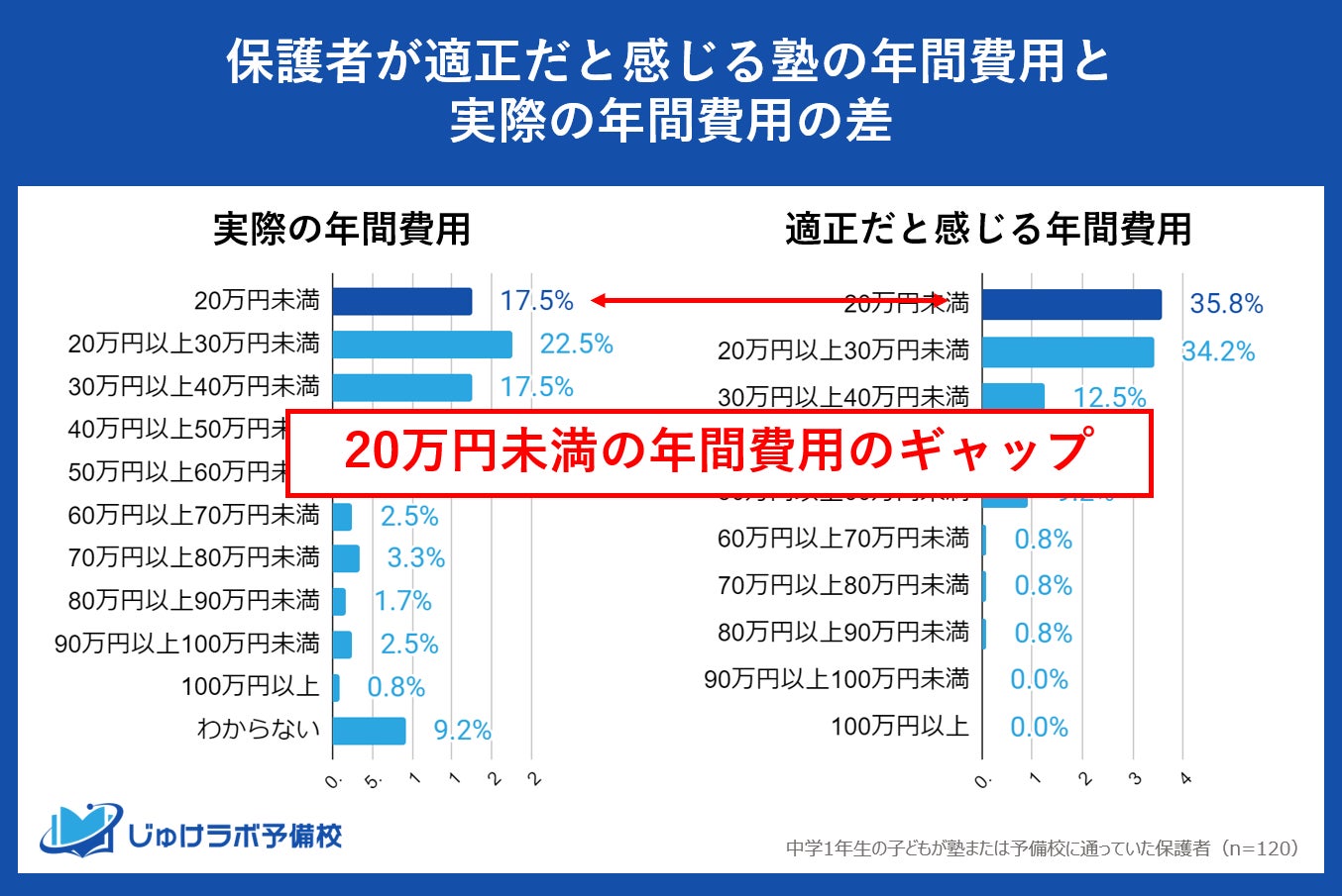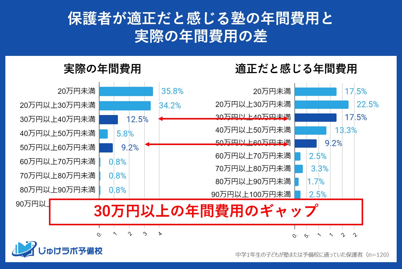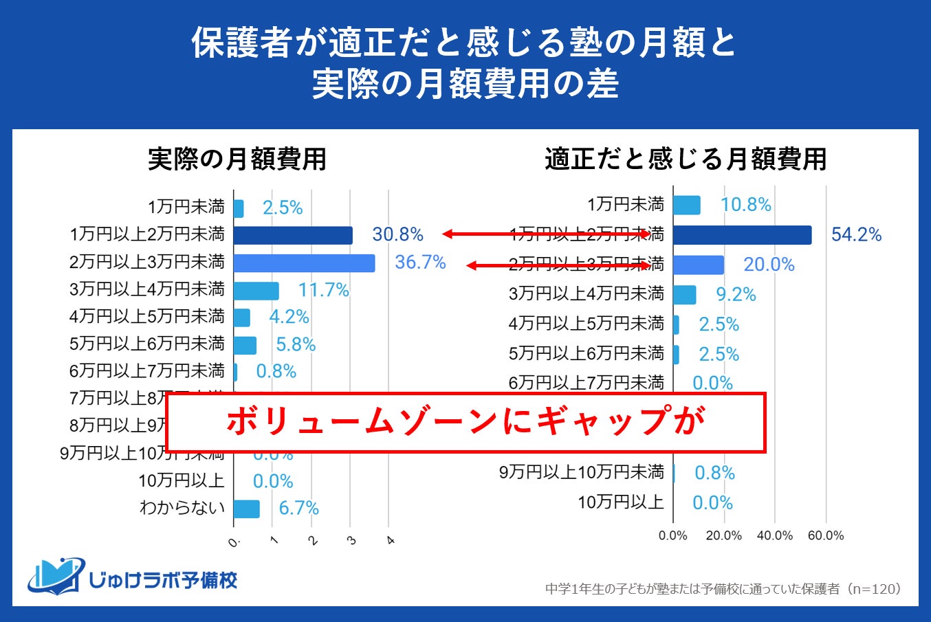 中学1年生の家庭の塾・予備校費用のギャップ - 実際の支出と適正価格の相違