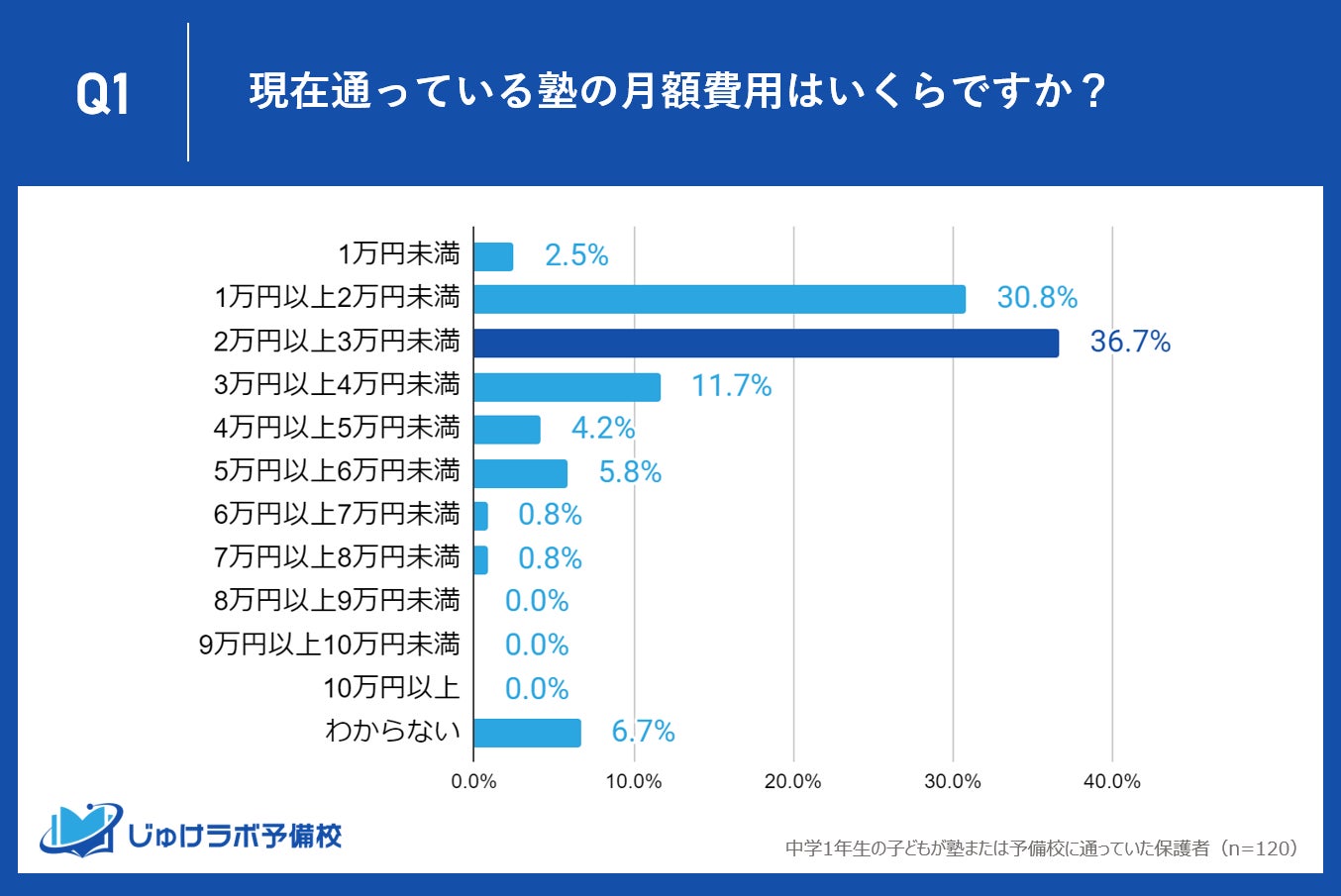 調査結果によると、中学1年生の家庭が塾に支払っている月額費用は「2万円以上3万円未満」が36.7%と最も多く、次いで「1万円以上2万円未満」が30.8%となっています。