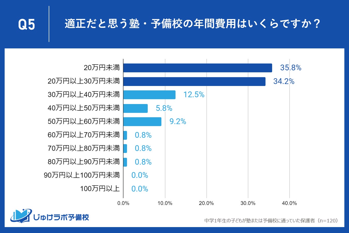 調査結果によると、年間で20万円未満を適正と考える保護者が35.8%、20万円以上30万円未満と答えた保護者が34.2%で、合わせて70%の保護者がこの価格範囲を塾や予備校の適正な年間費用としています。