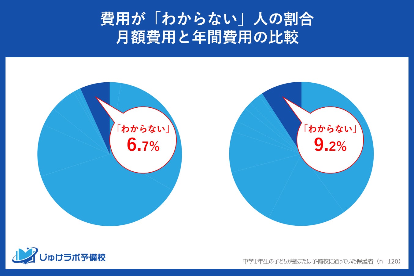 中学生の塾や予備校の年間費用について「わからない」と回答した保護者の割合が9.2%に上り、これは月間費用に関する不明瞭さ「6.7%」よりも高い数値です。この数値は教育費用の全体像に対する保護者の理解の不足を示しています。
