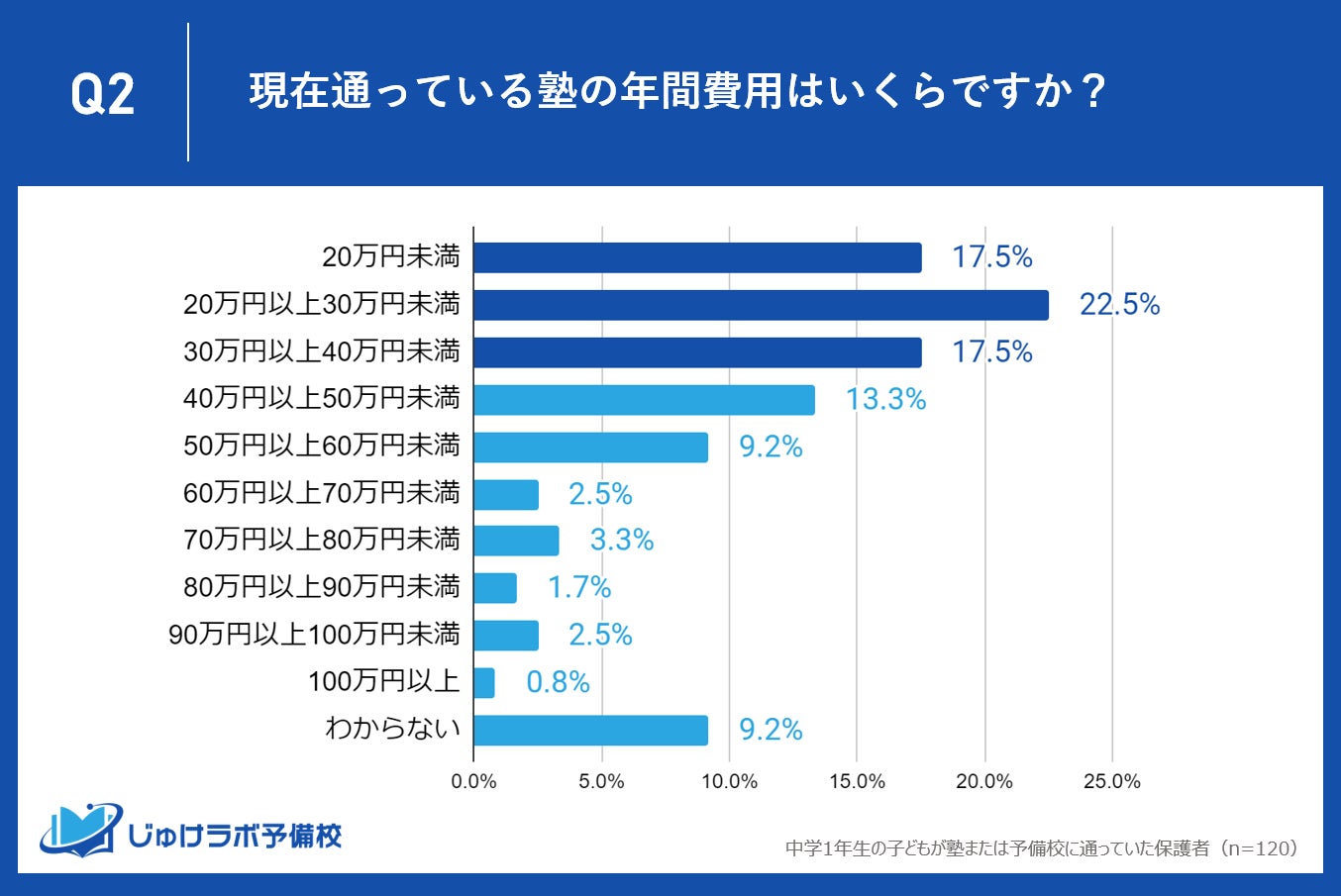 調査結果によると、中学1年生の家庭の塾代の年間費用が「20万円以上30万円未満」の割合が22.5%と最も多く、続いて「20万円未満」と「30万円以上40万円未満」が17.5%で同率で多いことが分かりました。
