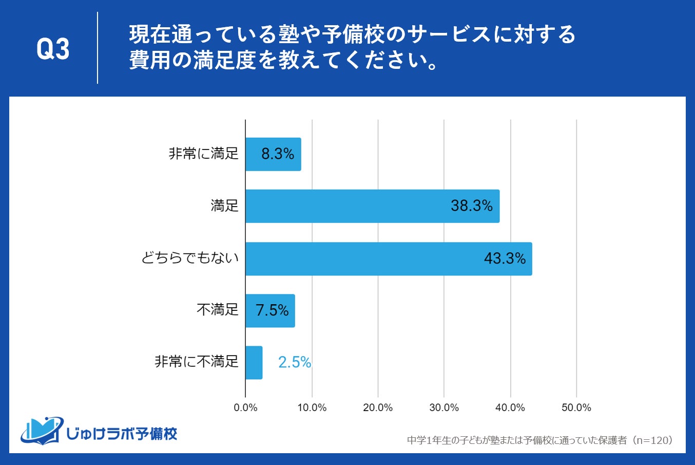 46.6%の保護者が塾費用に対して「満足」または「非常に満足」と回答したが、43.3%は明確な評価を下せず中立的な立場